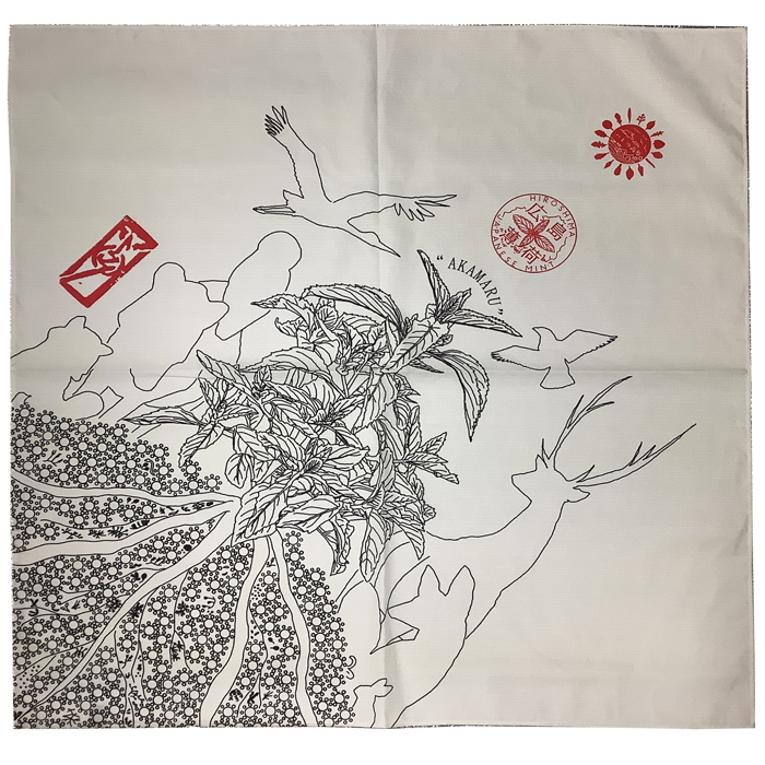 現在私は、かつて広島県でも栽培が盛んだったという歴史の残る「ニホンハッカ」の栽培を行い、ハーブティーに加工して茶葉の販売や加工原料としての卸売を行っております。今回の風呂敷のデザインはそのハーブティーのパッケージを作成した際に描いたデザインやロゴを使用し、メッセンジャーバッグ的に使用した際に映えるデザインを目指して作成してみました。