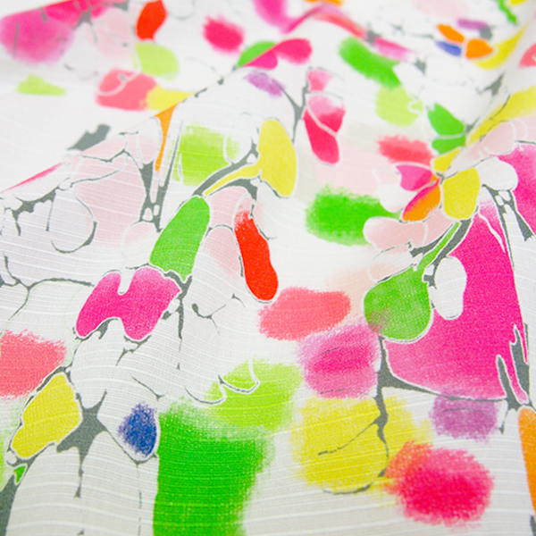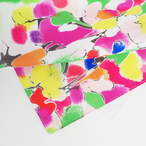 描かれていますが、はらはらと散っている花びらは、春らしい元気なビタミンカラーで彩られています。
